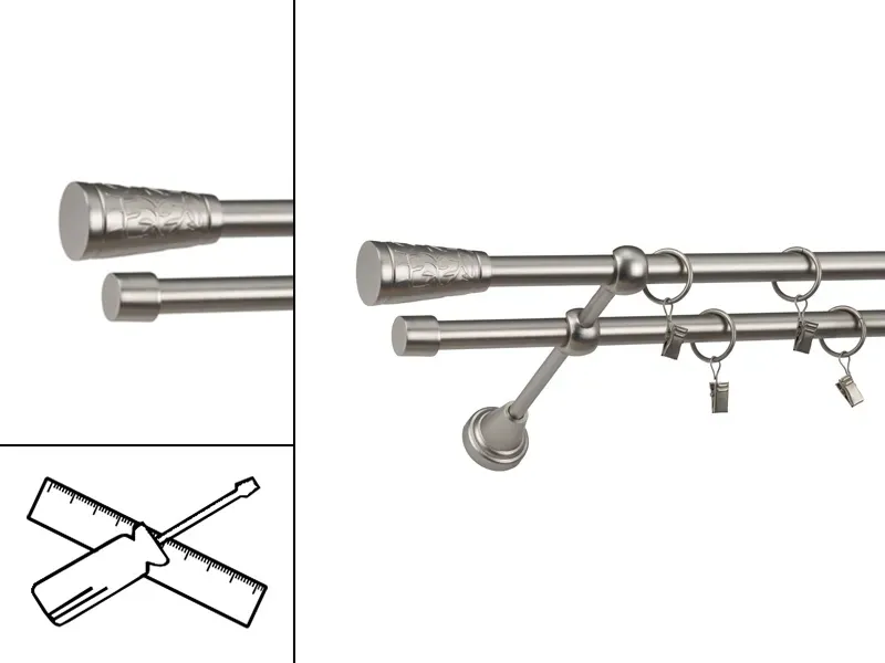 • Dĺžka 1200 mm - tyč 16mm - 1200mm - 2ks, držiak dvojitý - 2ks, koncovka - 2ks, koncovka zadná (PULLO) - 2ks, krúžok so štipcom - 22ks (pri výbere parametra príslušenstvo s krúžkami so štipcom), skrutky a hmoždinky na montáž