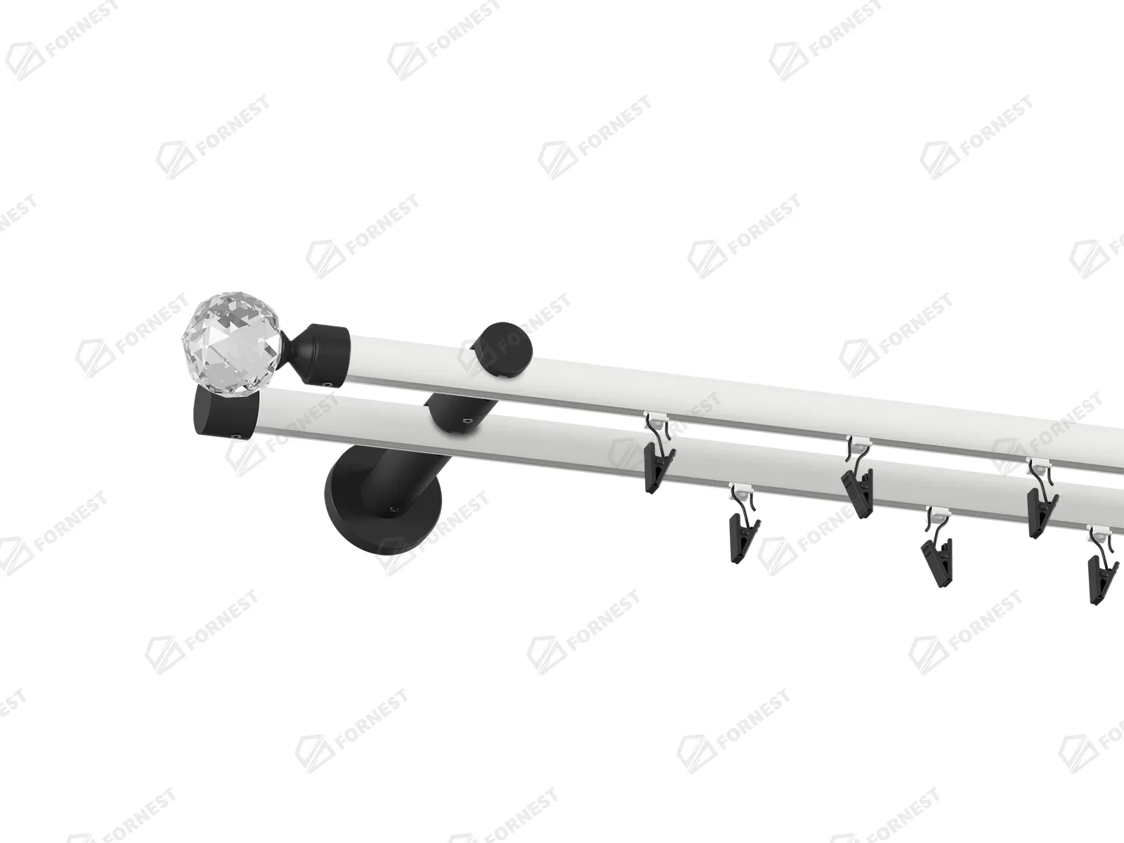 • Dĺžka 1600 mm - tyč 19mm - 1600mm - 2ks, držiak dvojitý - 2ks, koncovka - 2ks, koncovka zadná (PULLO) - 2ks, krúžok so štipcom - 30ks (pri výbere parametra príslušenstvo s krúžkami so štipcom), skrutky a hmoždinky na montáž