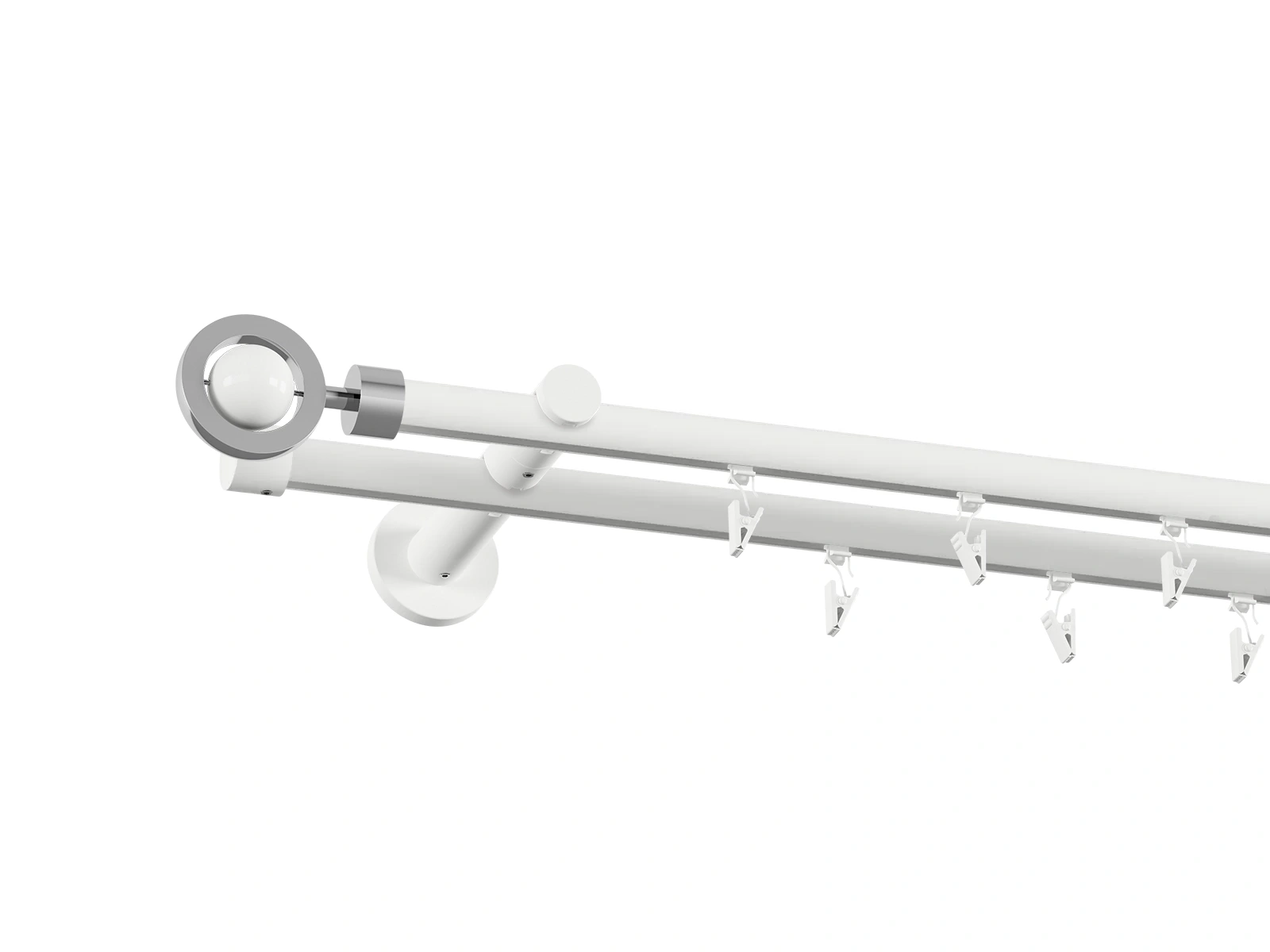 • Dĺžka 1600 mm - tyč 19mm - 1600mm - 2ks, držiak dvojitý - 2ks, koncovka - 2ks, koncovka zadná (PULLO) - 2ks, krúžok so štipcom - 30ks (pri výbere parametra príslušenstvo s krúžkami so štipcom), skrutky a hmoždinky na montáž