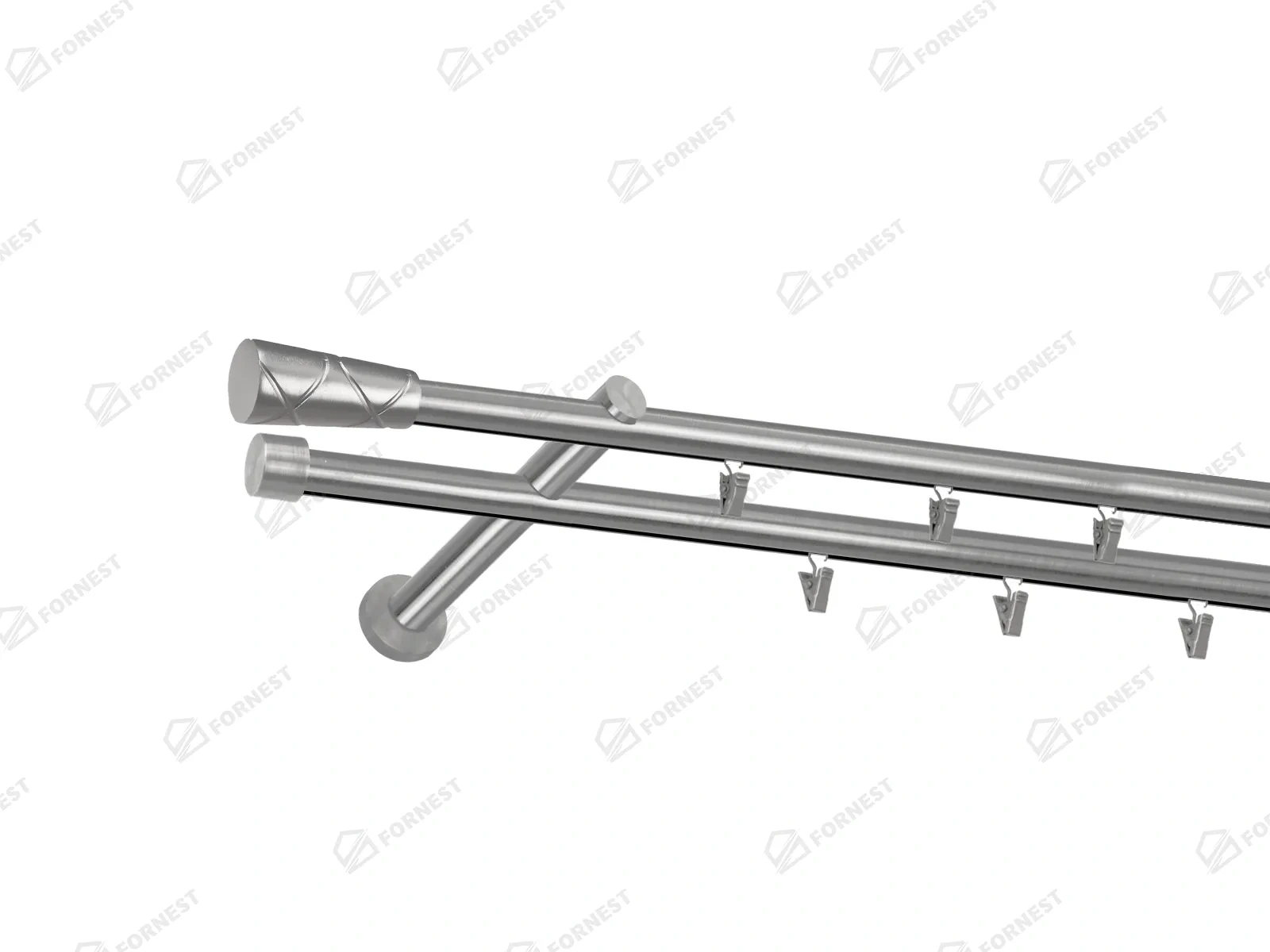 Dvojradová garniža s povrchovou úpravou - odtieň satin-nikel (matné striebro). Celokovové garniže s kvalitnou povrchovou úpravou - galvanické pokovovanie. Galvanické pokovovanie zabezpečuje vyššiu povrchovú tvrdosť, zvýšenú dolnosť voči poškriabaniu, hladký povrch. Dodávané sú v kompletoch.