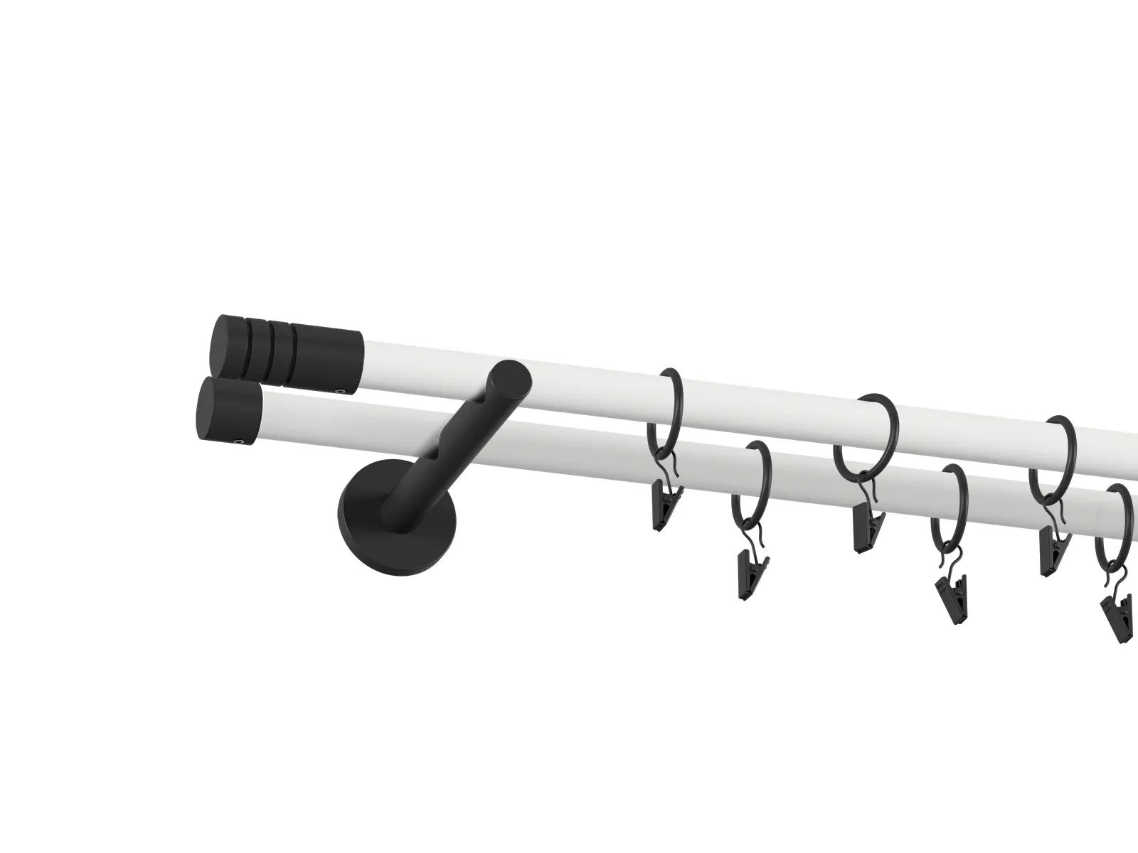 Na výber je viacero typov koncoviek a držiakov, čo umožňuje prispôsobiť garnižu presne podľa štýlu interiéru - od jednoduchých a nenápadných tvarov až po dizajnovejšie ukončenia, ktoré môžu slúžiť aj ako dekoratívny prvok. Pri prevedení bielo čiernej tyče je tyč biela a koncovky, držiaky a štipce s krúžkami čierne. Veľkou výhodou obyčajnej tyče je jej univerzálnosť. Ak máte závesy, v ktorých sú už našité kovové alebo textilné očká (krúžky), nie je potrebné dokupovať krúžky so štipcami. Záves stačí jednoducho nasunúť priamo na tyč, čo šetrí čas aj náklady a zároveň zabezpečuje čistý vzhľad.