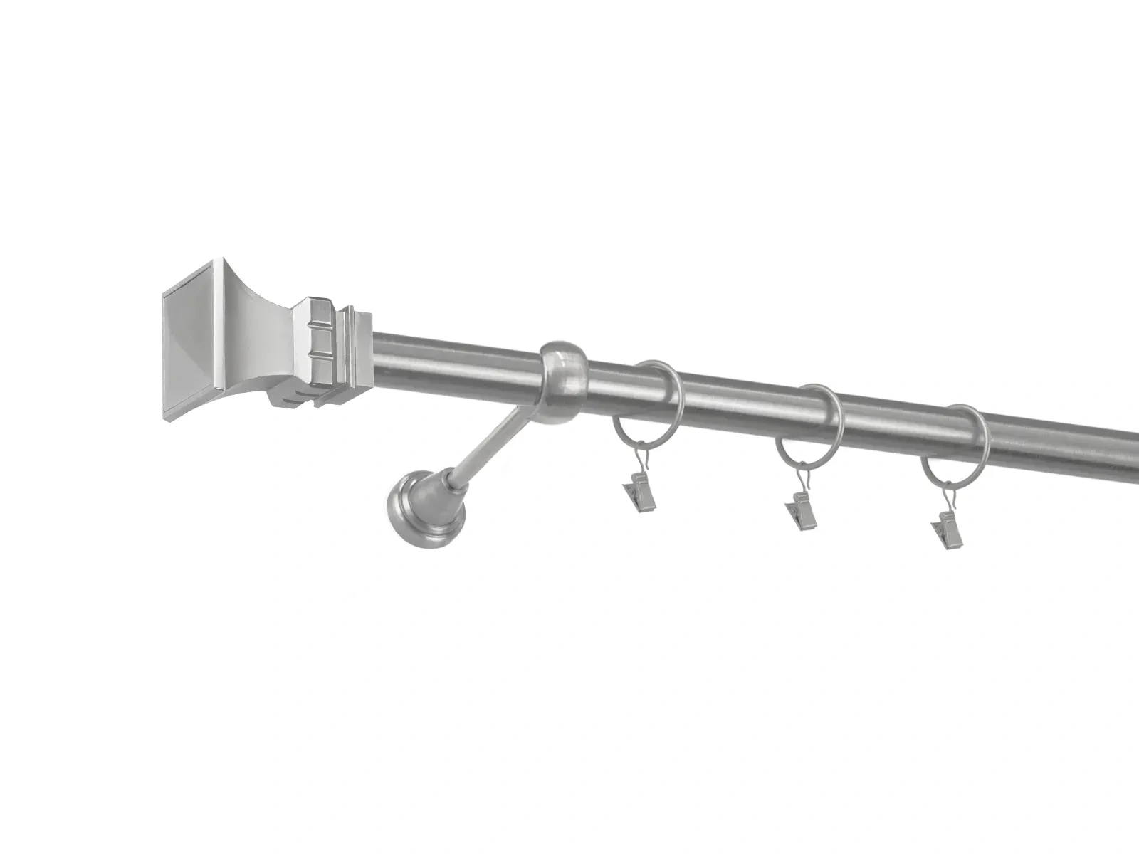 • V prípade, že ste si objednali ku garniži príslušenstvo, navlečte krúžky so štipcami na tyč., Následne dotiahnite poistné skrutky na držiaku, ktoré zabránia pohybu tyče.